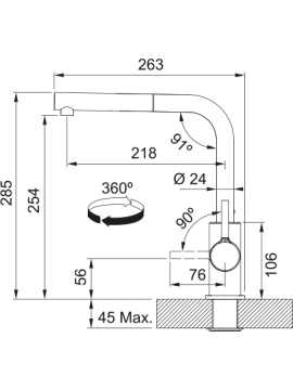 Mitigeur chromé Filtre anticalcaire Cartouche à disque en céramique Pièces de renforcement pour évier en cuivre Flexible de raccordement en inox Perforation. diamètre : 46 mm Hauteur totale : 201 mm Hauteur sous bec : 140 mm Degré de rotation : 360°